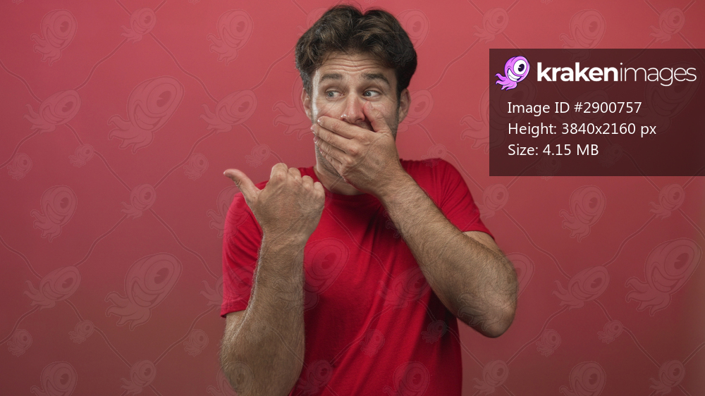 Young hispanic man covering mouth with hand and pointing thumb to side while looking aside in red studio; surprise mischief.