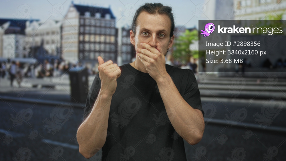 Young hispanic man covering mouth with hand and thumb pointing to side on a busy city street; surprise secrecy concern.