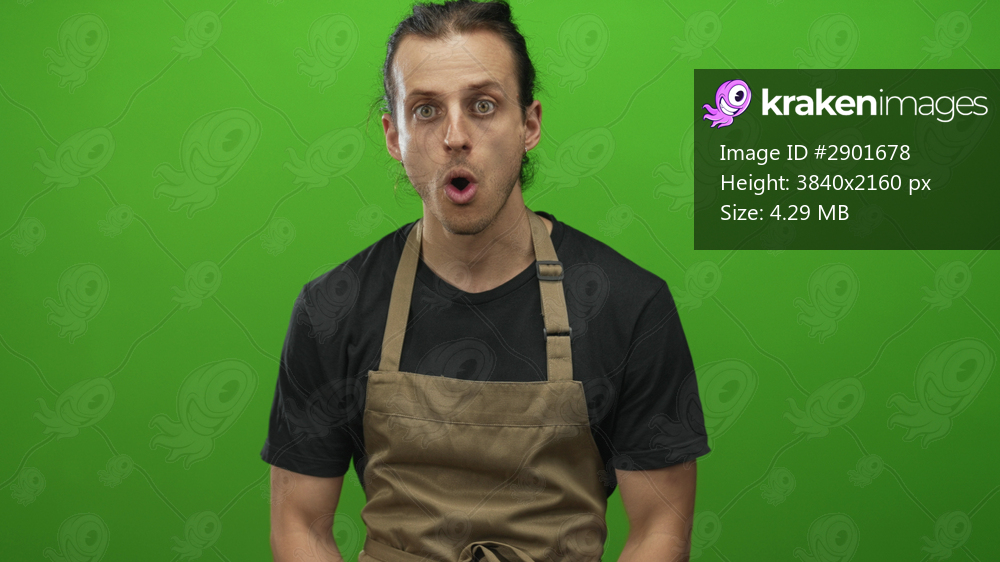 Young hispanic man covering mouth with hands wearing work apron in studio with vivid green wall; surprise reaction.