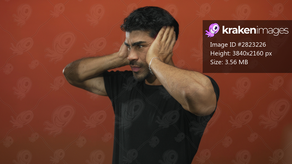 Young hispanic man covers ears with hands against orange studio wall; sound sensitivity overload anxiety.