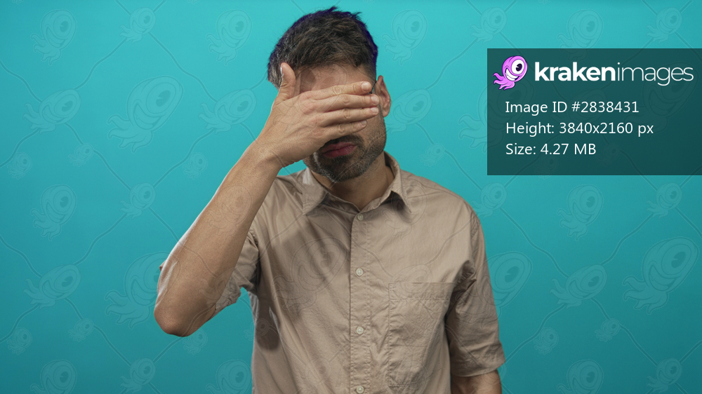 Young hispanic man covers eyes with hand in studio wearing beige shirt and glasses under bright lights; frustration.