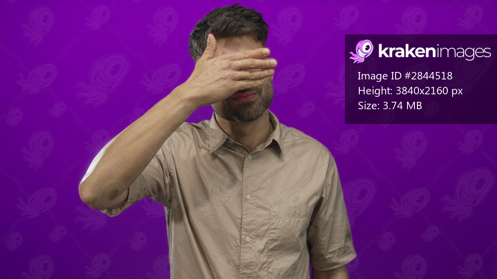 Young hispanic man covers eyes with hand and softly tilts head downward in purple studio; embarrassment.