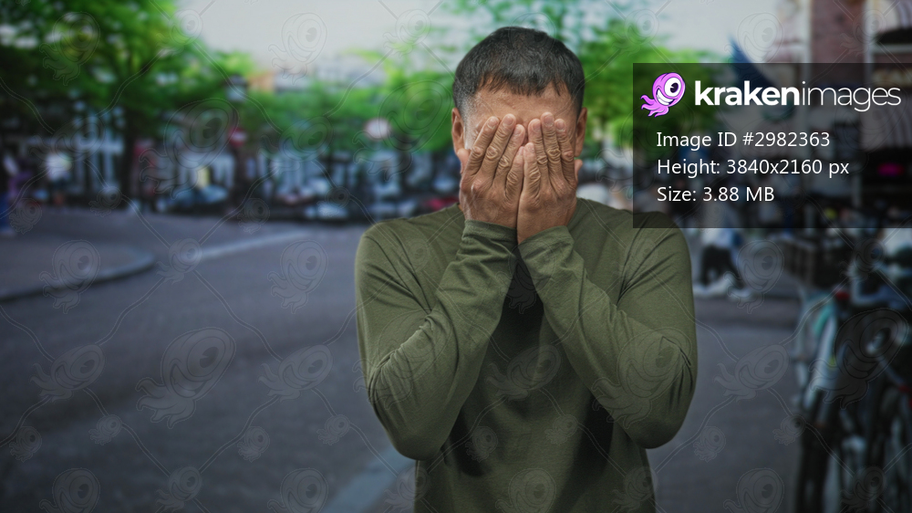 Young hispanic man covers his face with his hands on a busy street, wiping tears and squinting in visible distress; sorrow vulnerability.