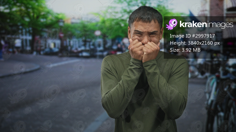 Young hispanic man covers his face with his hands on a busy street, wiping tears and squinting in visible distress; sorrow vulnerability.