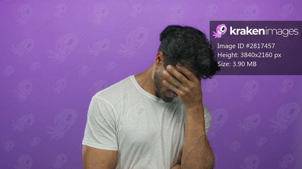 Young hispanic man covers left side of face with hand in purple studio; stress tension fatigue strain.
