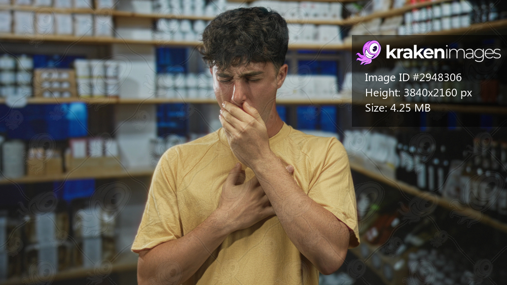 Young hispanic man covers mouth with hand and clutches chest while grimacing in a pharmacy building; nausea symptom.