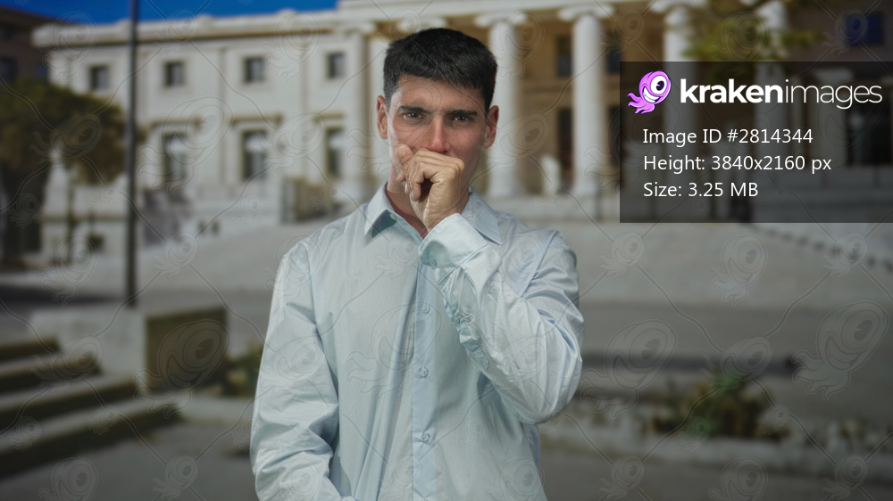 Young hispanic man covers mouth with hand for cough in front of columned building; health concern.