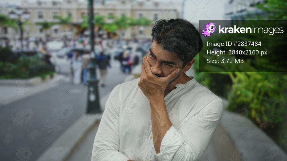 Young hispanic man covers mouth with hand while gazing downward in broad daylight on a busy city street; doubt.
