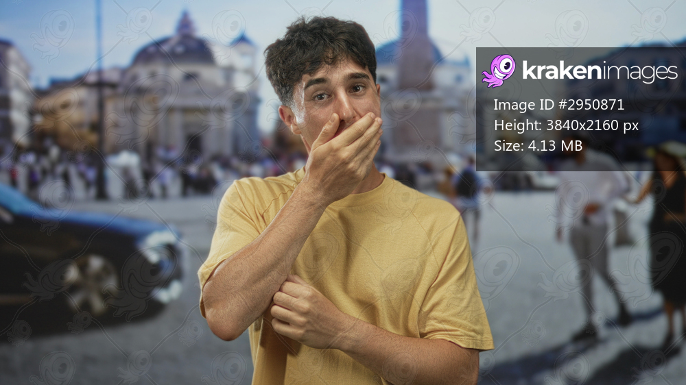 Young hispanic man covers mouth with hands standing outdoors in front of large church building at st peter square, vatican; surprise secrecy.