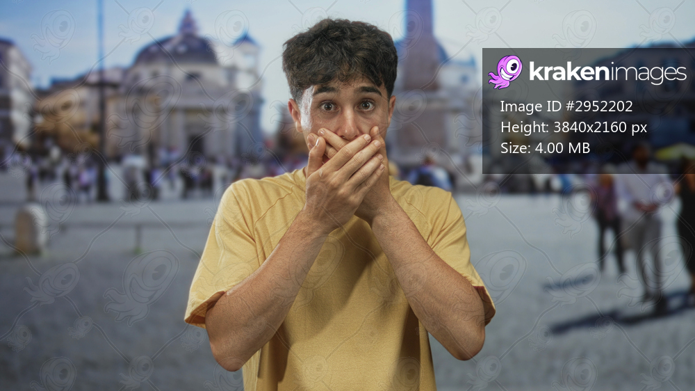 Young hispanic man covers mouth with hands standing outdoors in front of large church building at st peter square, vatican; surprise secrecy.