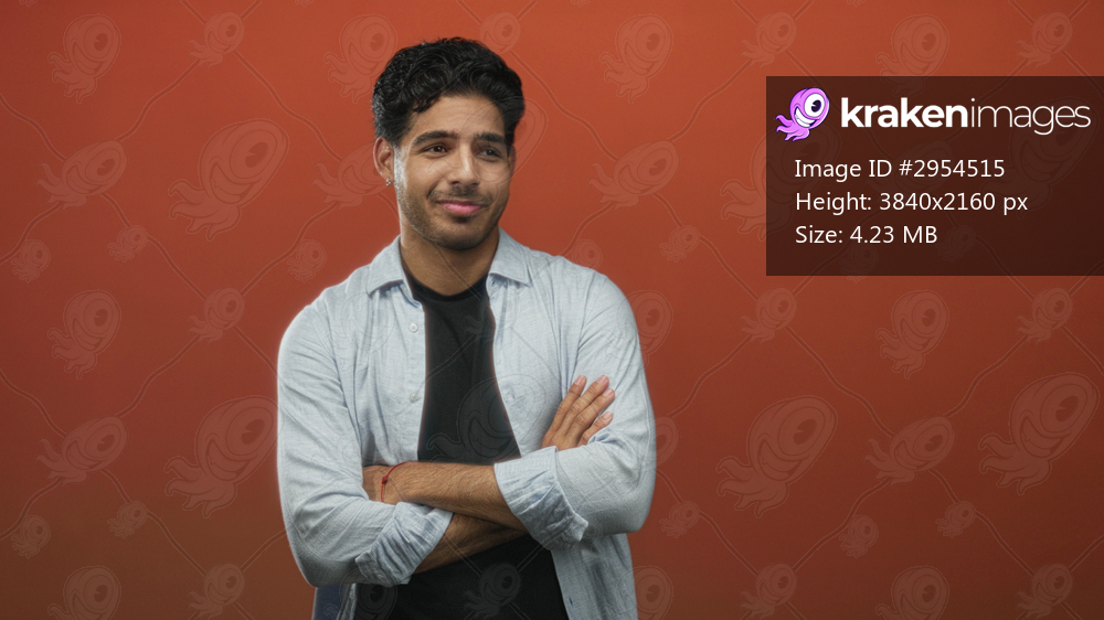 Young hispanic man with crossed arms and a half smile looking sideways in a red studio setting; wry skepticism.