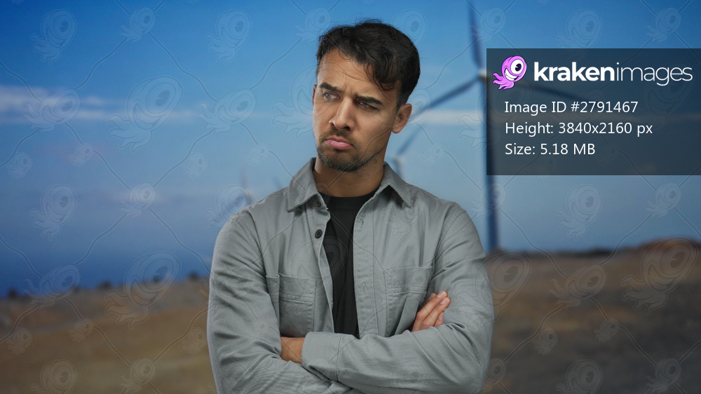 Young hispanic man with crossed arms appears thoughtful in a windmill field, showcasing renewable energy against a clear blue sky.