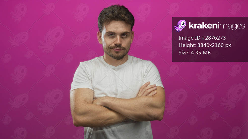 Young hispanic man with crossed arms and beard in a pink studio, eyes closed with a smug expression; confidence attitude.