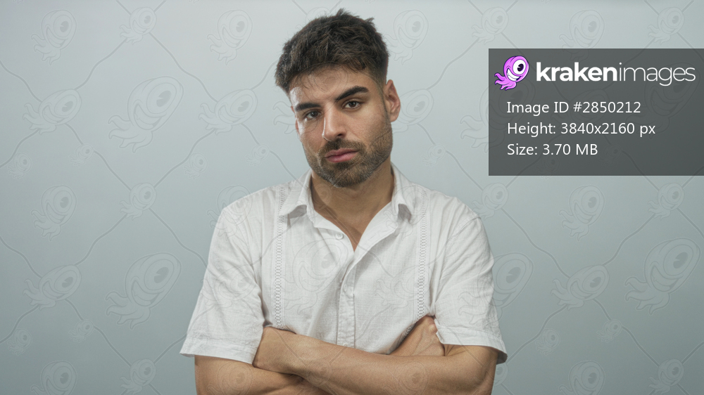 Young hispanic man with crossed arms and exposed forearms wearing a white shirt in light blue studio; rejection.
