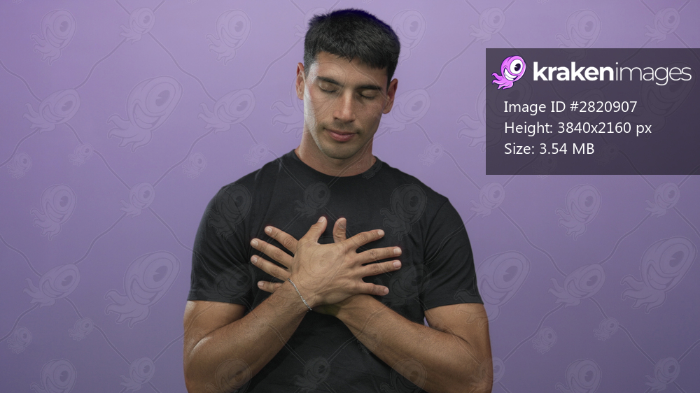 Young hispanic man crosses hands over chest in studio against purple backdrop with eyes closed; serenity.