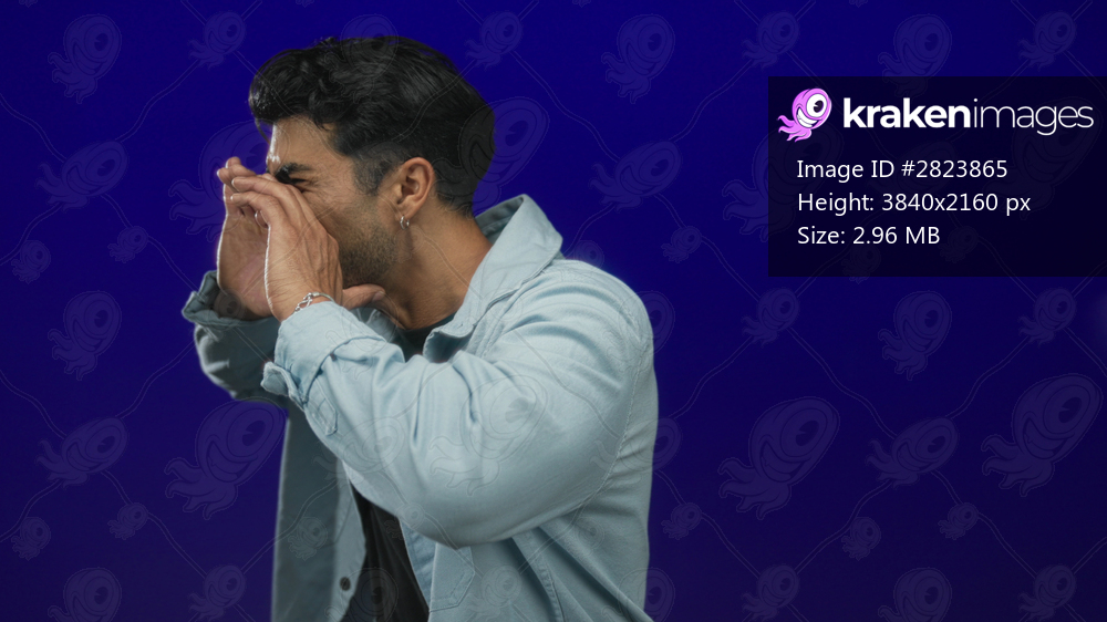 Young hispanic man cupping hands to mouth in studio with rich deep blue background; urgent announcement.