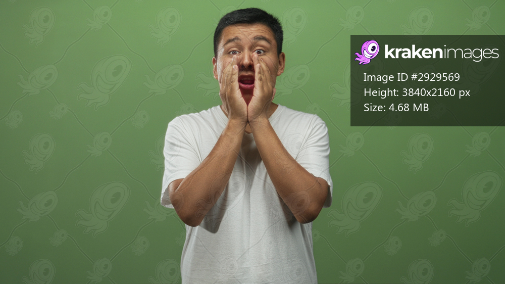 Young hispanic man cupping hands to mouth shouting in green studio, facing forward with open mouth and intense expression; surprise.