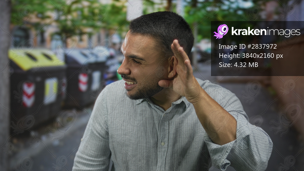 Young hispanic man cups ear beside recycling container on city street; listening challenge curiosity.