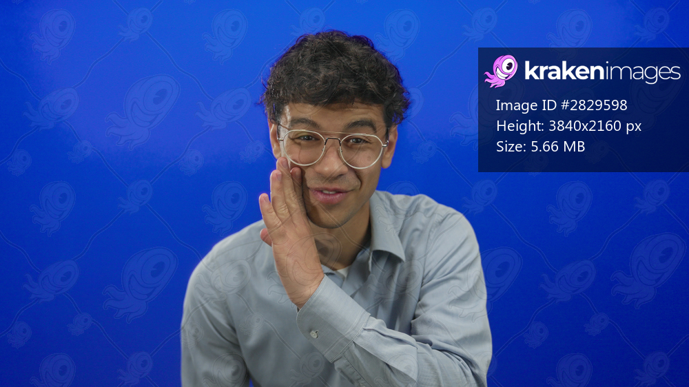 Young hispanic man cups hand to cheek while whispering in studio with blue background; secrecy intrigue.