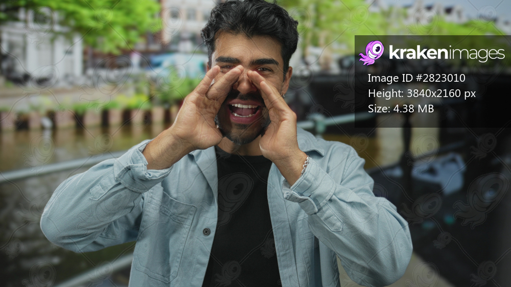 Young hispanic man cups hands around mouth shouting loudly with wide smile beside channel; enthusiasm.