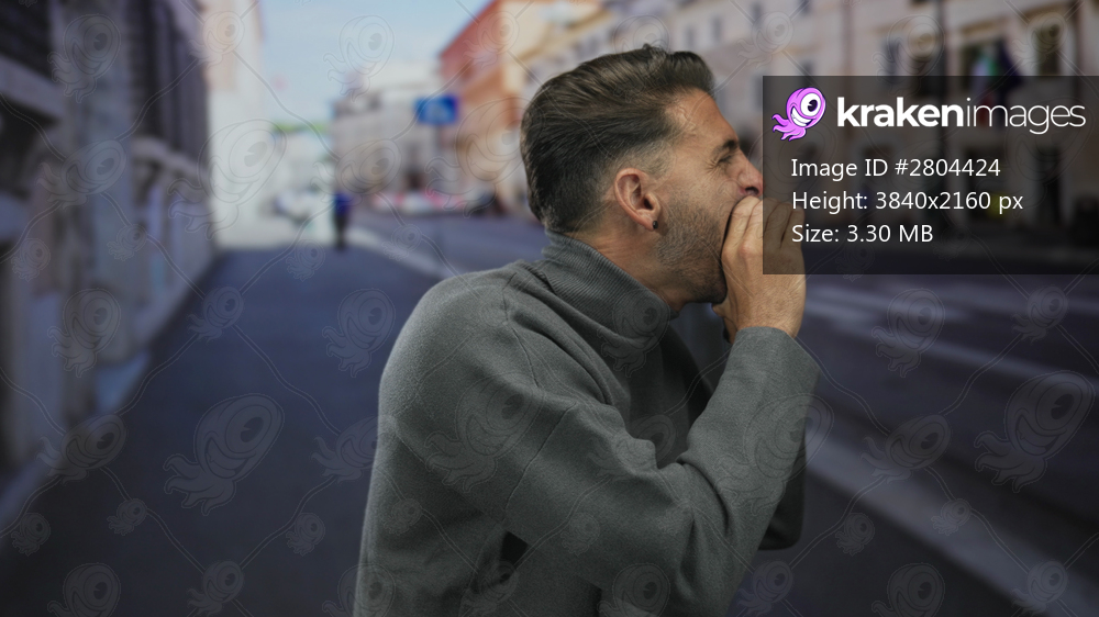 Young hispanic man cups hands around mouth shouting on busy urban street lined with buildings; public alert urgency.