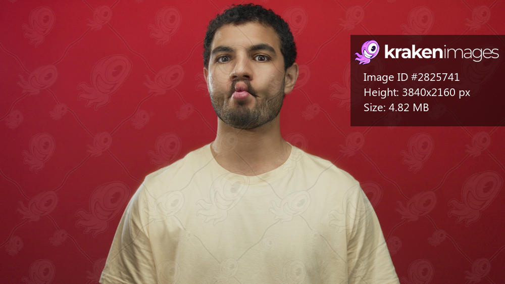 Young hispanic man with curly hair and beard stands and purses lips in a fish face pose in a red studio; joy.