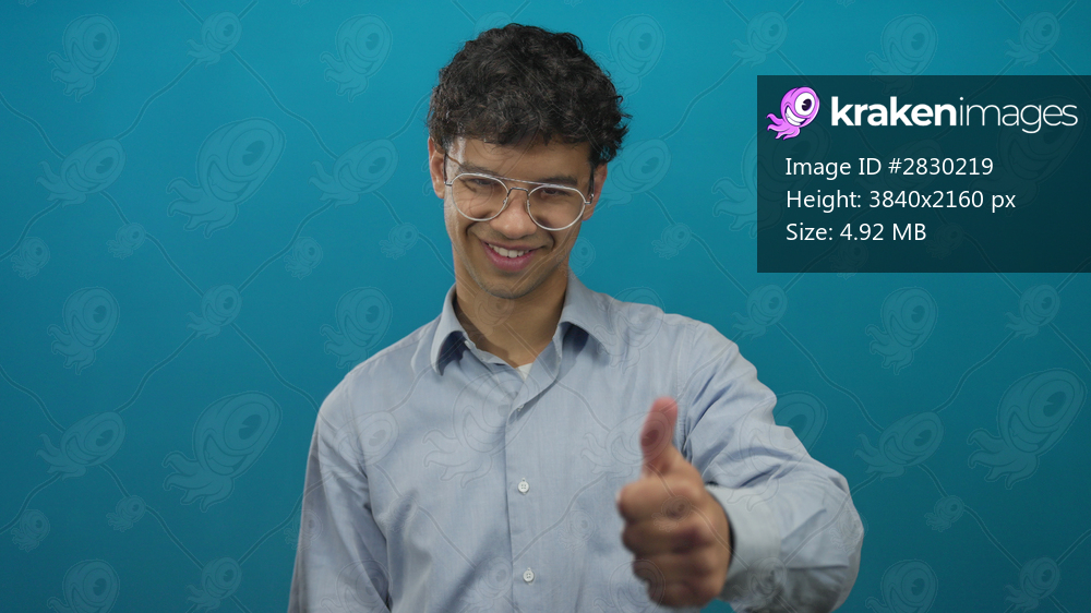 Young hispanic man with curly hair wearing glasses giving thumbs up gesture in a turquoise studio scene; approval.