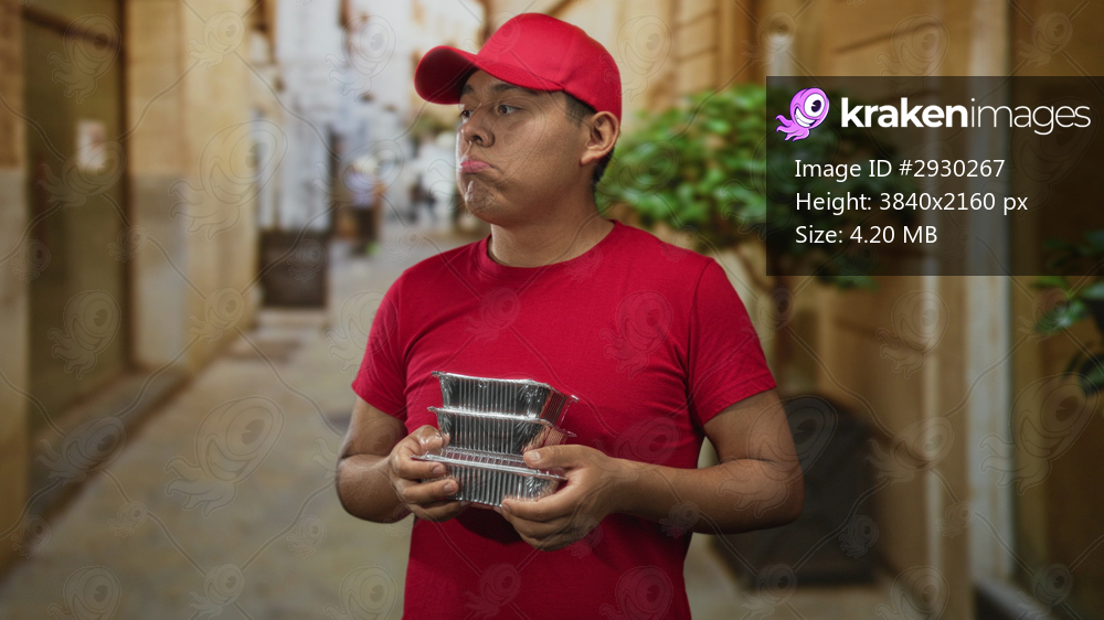 Young hispanic man delivery worker holding stacked foil food containers wearing red cap and shirt on urban street; duty fatigue.