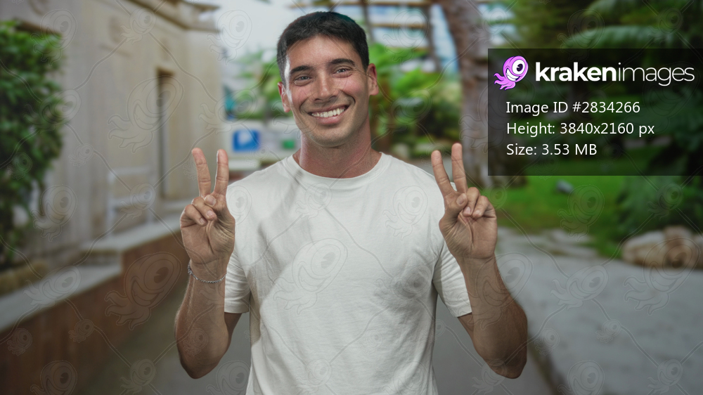 Young hispanic man displays victory sign with both hands wearing white shirt in front of building, smiling brightly; optimism.
