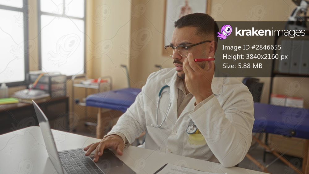 Young hispanic man doctor in white coat with stethoscope and glasses holding phone to ear at desk in clinic building while typing on laptop; determination care. - Kraken Images
