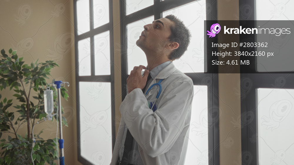 Young hispanic man doctor in white coat with stethoscope removes glasses in a clinic building near an iv stand by a window; fatigue.