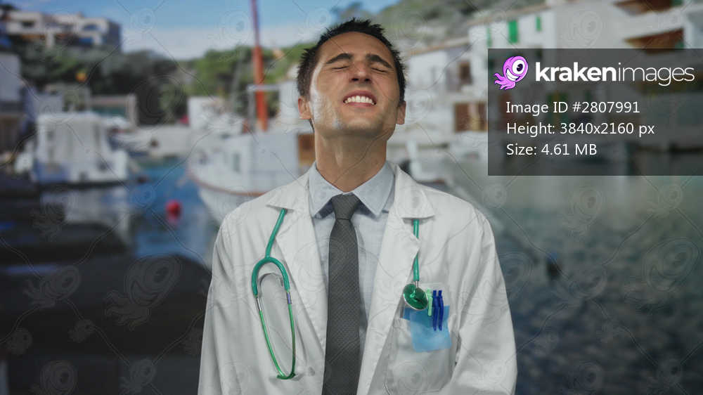 Young hispanic man doctor smiling outdoors with a stethoscope in uniform by boats at a seaside port setting in spain suggesting a casual medical environment - Kraken Images
