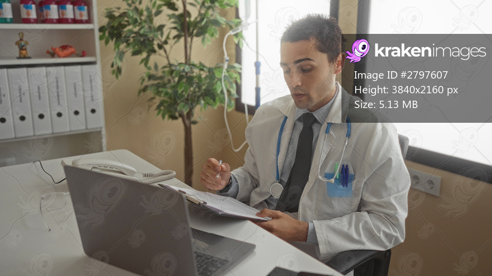Young hispanic man doctor with stethoscope in hospital room takes notes during online consultation in clinic office.