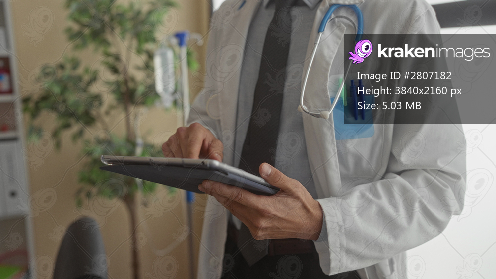 Young hispanic man doctor wearing stethoscope and uniform uses tablet in a clinic room, symbolizing indoor professional healthcare workplace.