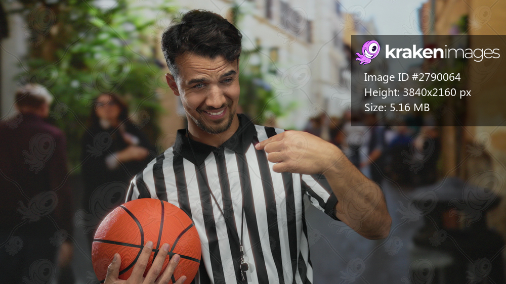 Young hispanic man dressed as a basketball referee holding a ball and pointing to himself on a busy city street.