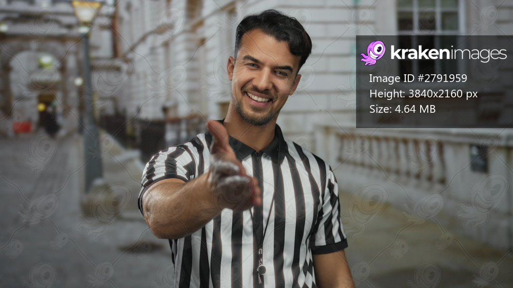 Young hispanic man dressed as a referee extends his hand for a handshake on a city street, smiling warmly and standing outdoors in an urban environment. - Kraken Images