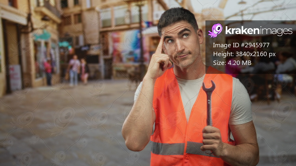 Young hispanic man and engineer in orange safety vest holds a wrench and points finger to temple on a street in a city; thoughtful problem solving.