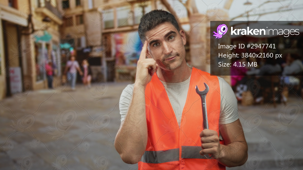 Young hispanic man and engineer in orange safety vest holds a wrench and points finger to temple on a street in a city; thoughtful problem solving.