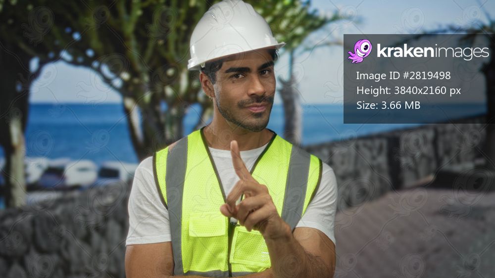Young hispanic man engineer in white hardhat and reflective vest points finger upward on street; caution.