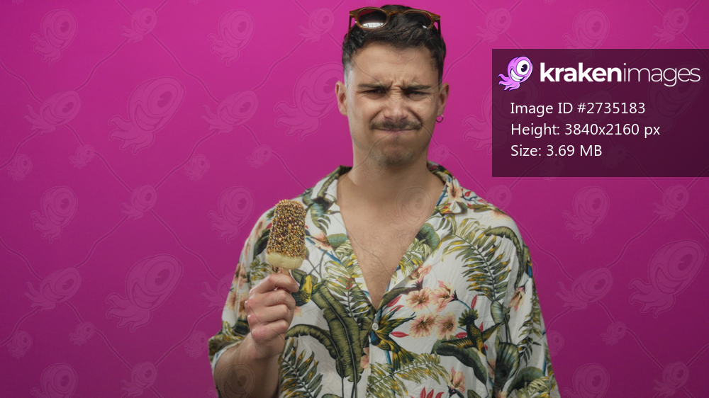 Young hispanic man enjoying ice cream against vibrant pink background, expressing emotions, wearing a tropical shirt, sunglasses on head, embodying a carefree tourist vibe. - Kraken Images