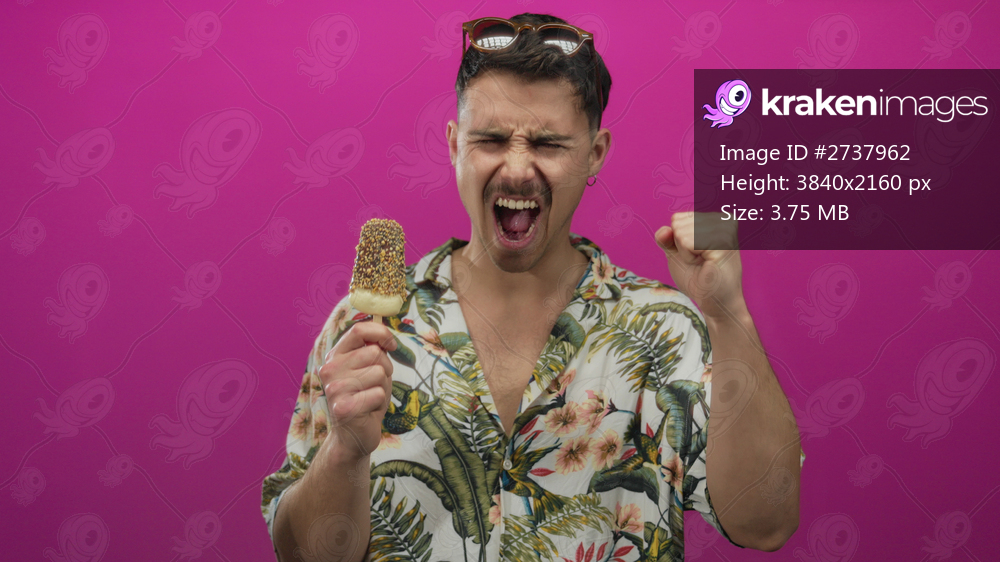Young hispanic man enjoying ice cream against vibrant pink background, expressing emotions, wearing a tropical shirt, sunglasses on head, embodying a carefree tourist vibe. - Kraken Images