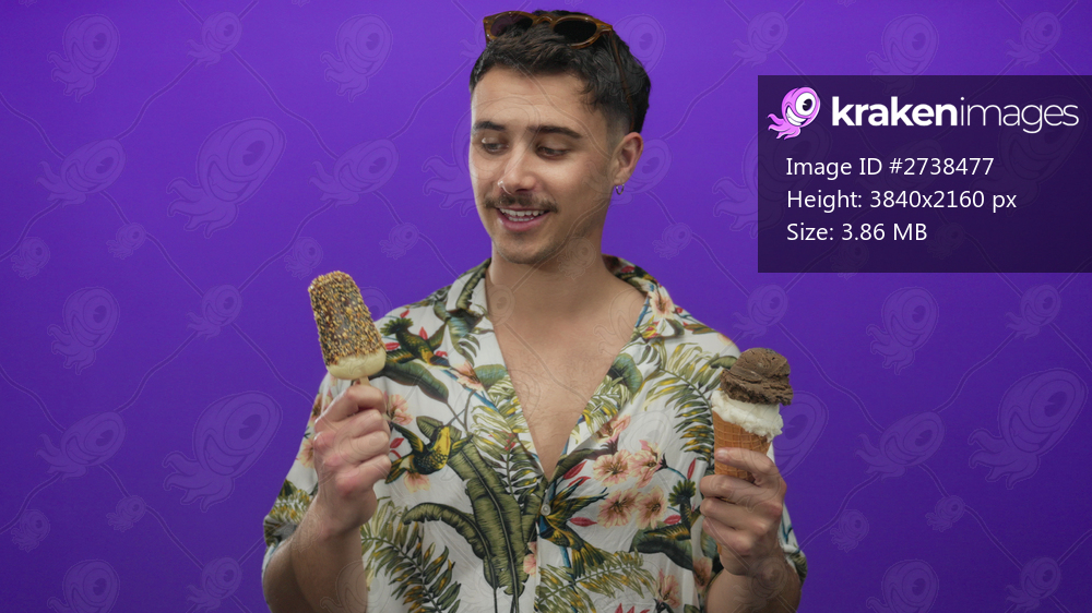 Young hispanic man enjoying ice cream against vibrant purple background wearing tropical shirt and sunglasses with a cheerful tourist vibe, holding cone and stick desserts. - Kraken Images