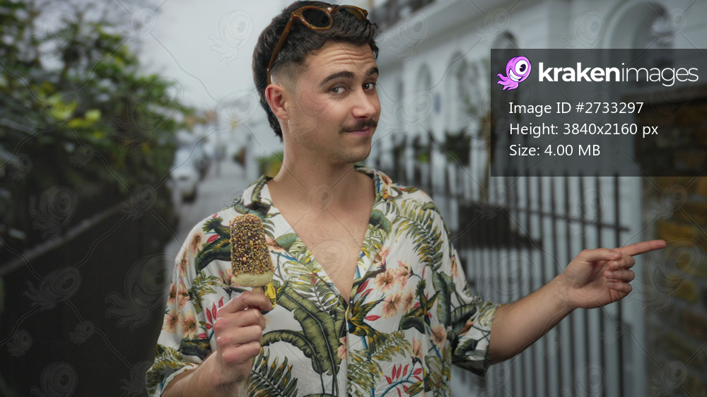 Young hispanic man enjoying ice cream on a city street, wearing a floral shirt and sunglasses, embracing a relaxed tourist vibe outdoors with a cheerful demeanor. - Kraken Images