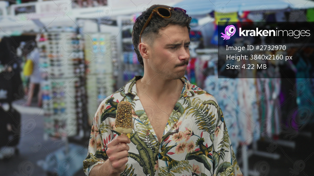 Young hispanic man enjoys ice cream in a vibrant outdoor market surrounded by clothing stalls and city scene, capturing urban tourism ambiance.
