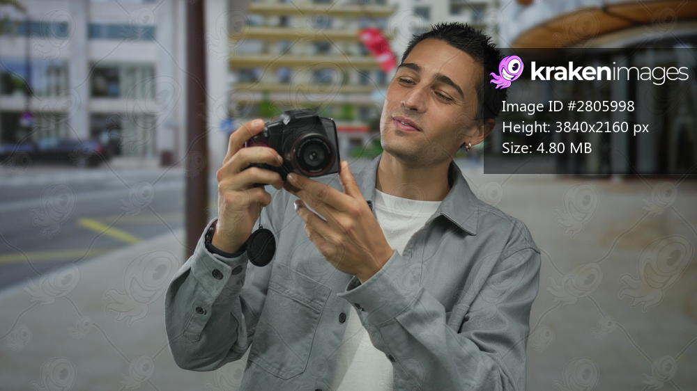 Young hispanic man examines camera with curiosity on an urban city street, surrounded by tall modern buildings, showcasing an intriguing blend of technology and metropolitan life. - Kraken Images