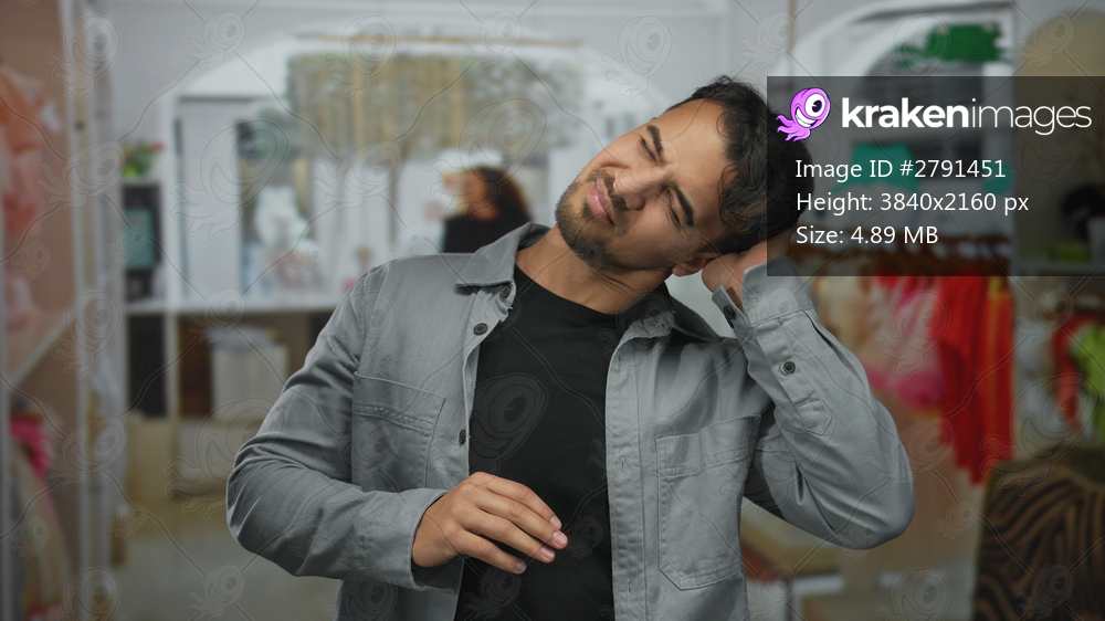 Young hispanic man experiencing neck pain inside clothing shop surrounded by vibrant dresses and retail displays