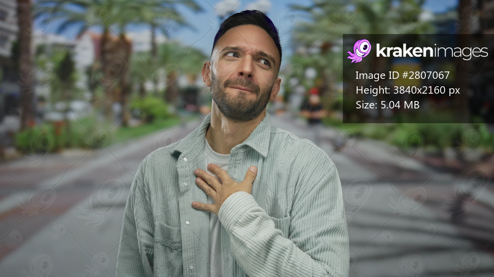 Young hispanic man expressing emotions on an urban city street with palm trees and vibrant background.