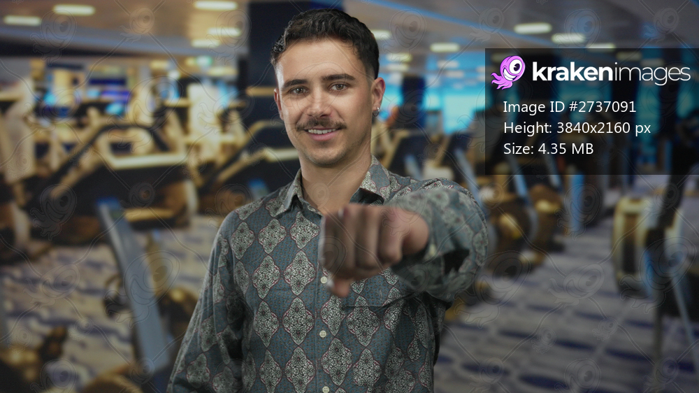 Young hispanic man extends arm with clenched fist towards camera in a bustling gym filled with fitness equipment, embodying determination and focus.