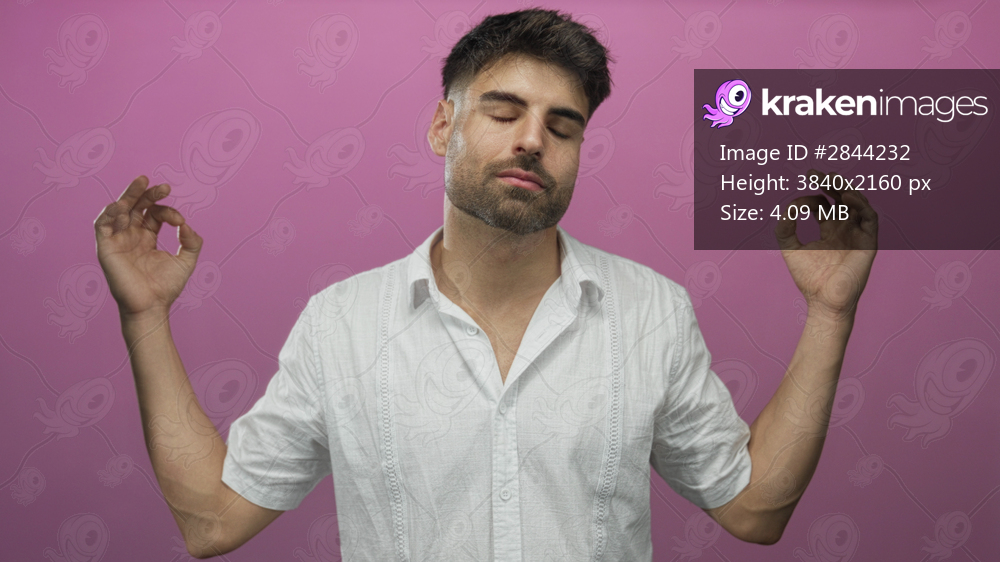 Young hispanic man with eyes closed shows ok sign with hands in pink studio; serenity calmness mindfulness meditation