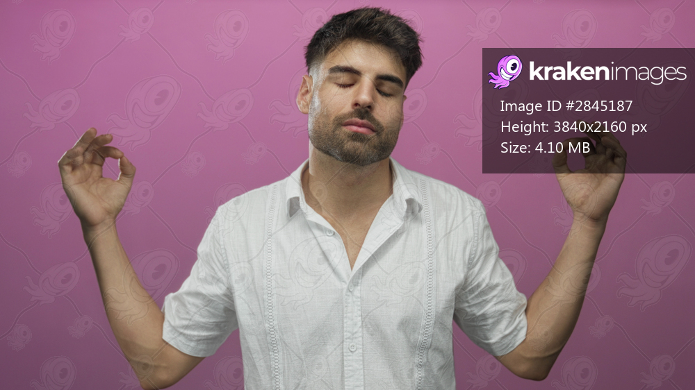 Young hispanic man with eyes closed shows ok sign with hands in pink studio; serenity calmness mindfulness meditation
